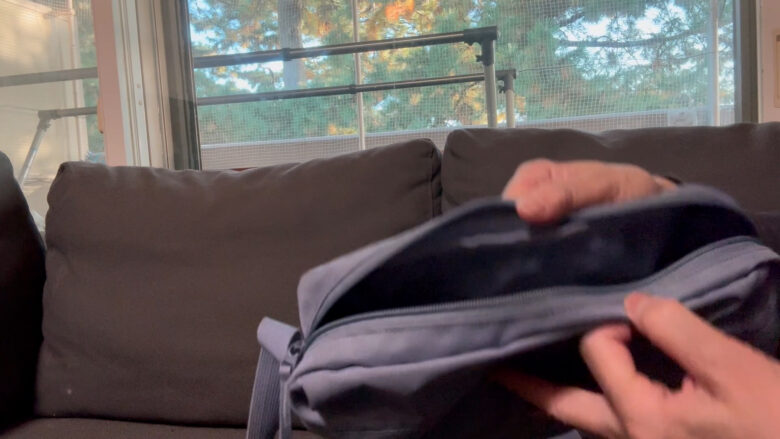 私が今使っているのは無印良品の撥水ショルダーバッグです。ナイロン生地に撥水加工がしてあるので触ると少し「ガサガサ」します。